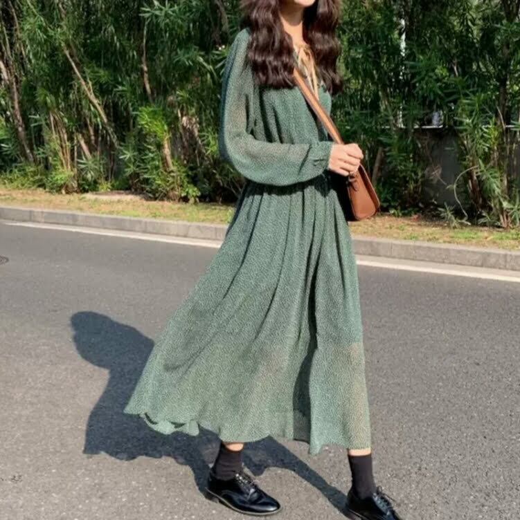 カットソーワンピース ロング丈 ハイウエスト 長袖 ドット柄 ゆったり 着やせ 大人可愛い カジュアル とろみ お出かけ デート 秋冬