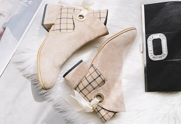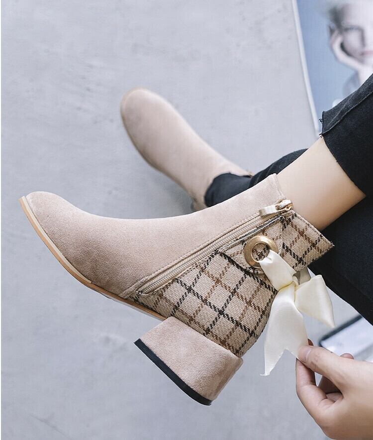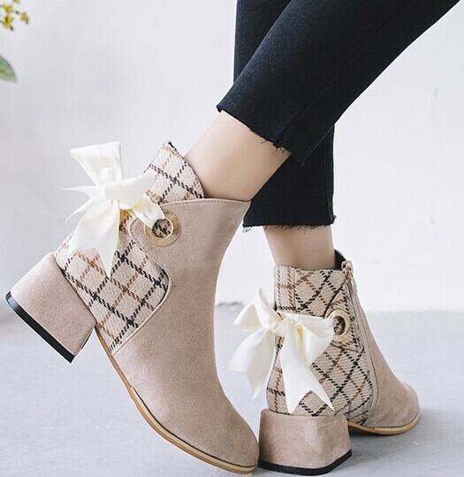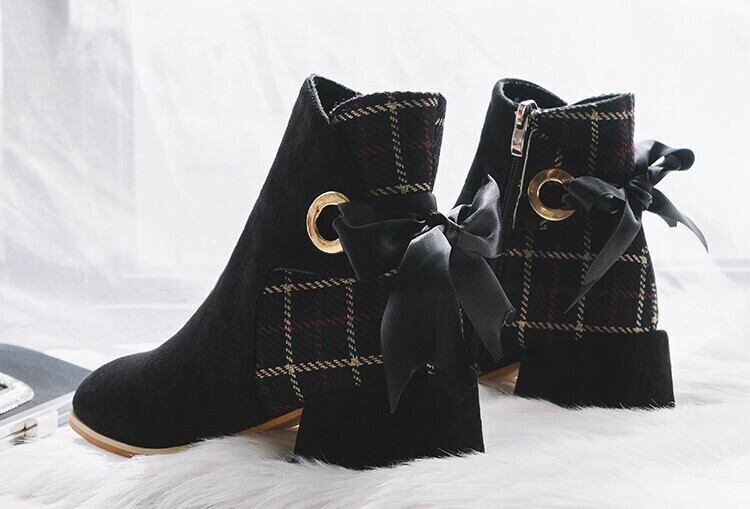 全2色 ショートブーツ チェック柄 サイドジッパー リボン ハイヒール 太ヒール カジュアル フェミニン 秋 冬 デート お呼ばれ ベージュ ブラック 韓国 オルチャン