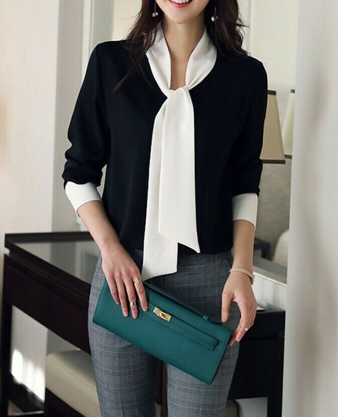 ボウタイブラウス リボン ブラック ホワイト 七分袖 Vネック オフィスカジュアル 通勤 通学 上品 エレガント 韓国 オルチャン クラシカル 大人かわいい