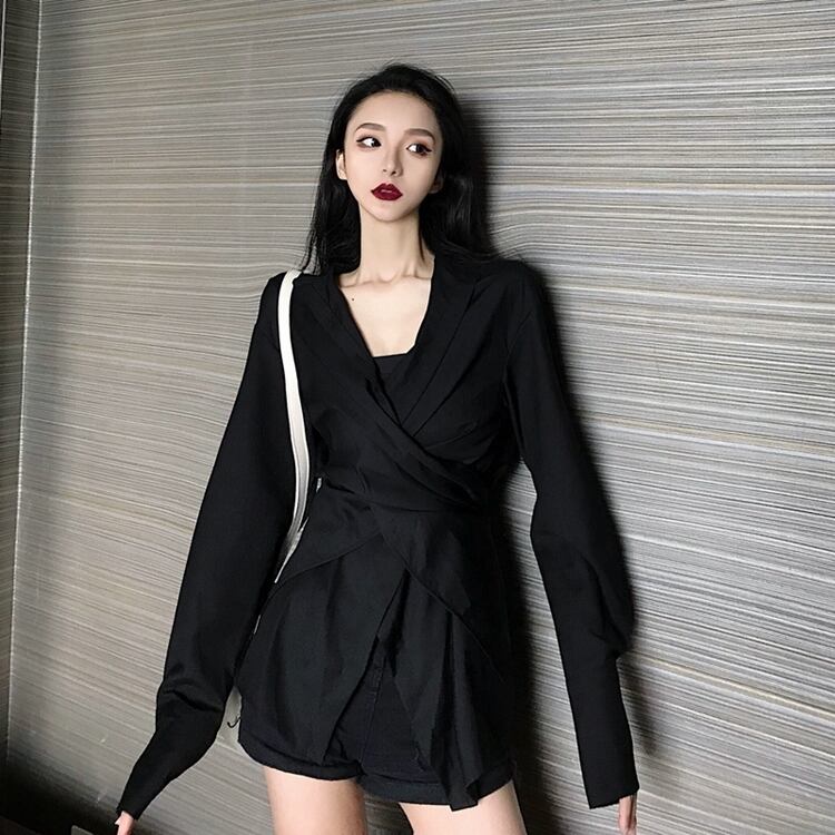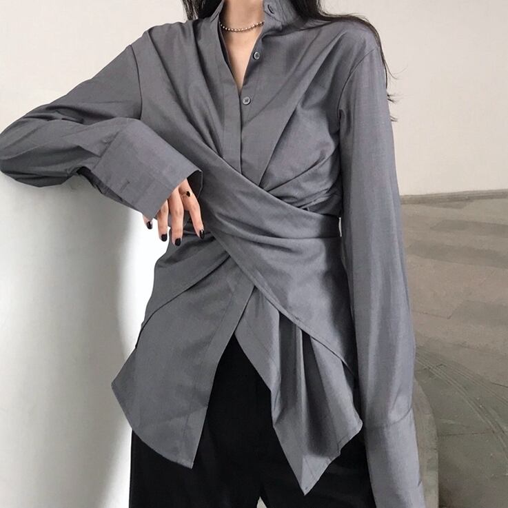 全2色 シャツブラウス スタンドカラー 2wat 無地 イレギュラーデザイン 長袖 カジュアル オフィス ブラック グレー 秋冬