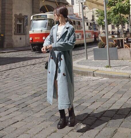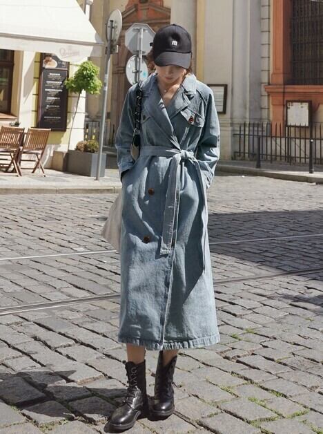 オータムコート デニム ジーンズ ブルー アウター 羽織 長袖 ラグランスリーブ ウエストベルト 秋 大人カジュアル 上品 エレガント 韓国 オルチャン