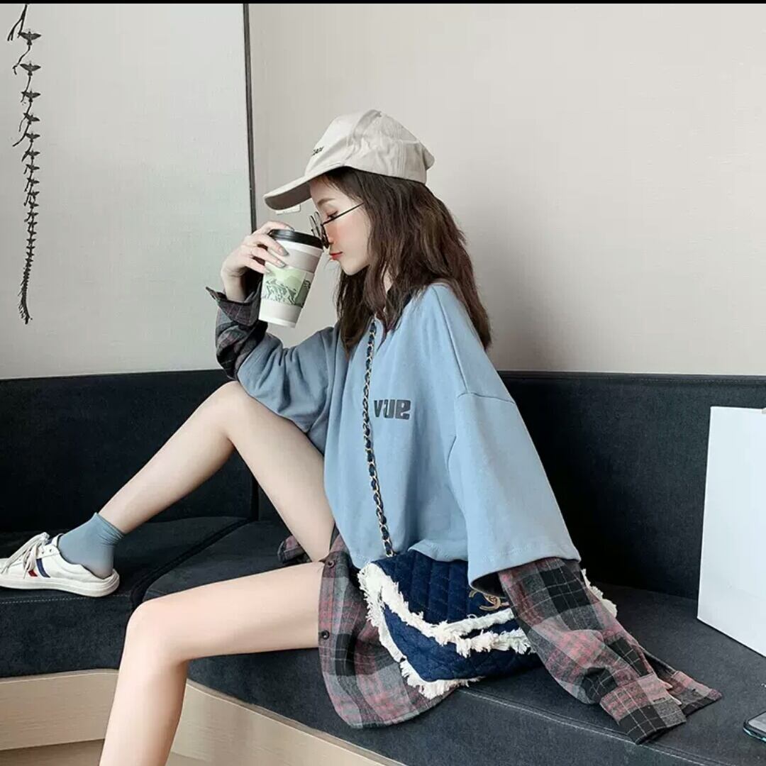 全2色 異素材 切り替え プルオーバー チェック柄 トップス 長袖 大人 カジュアル 可愛い お出かけ お買い物 デート 女子会 秋冬 春 学生