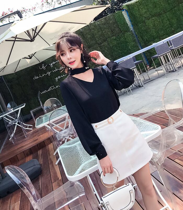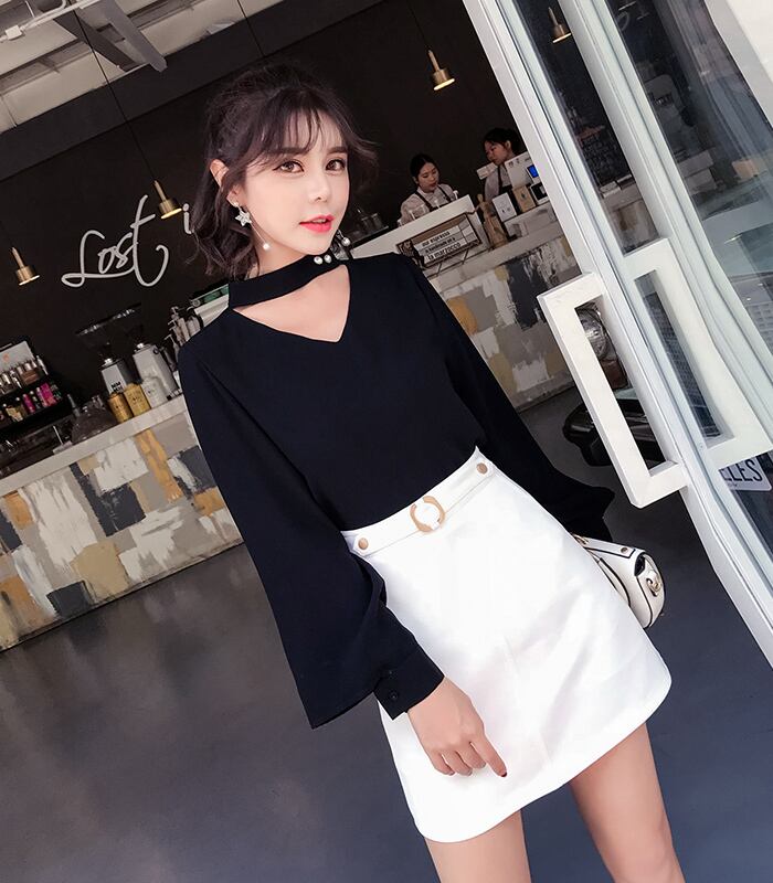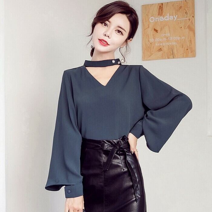 全3色 チョーカーネックブラウス シャツ Vネック フレアスリーブ パールボタン シンプル ネイビー ホワイト ブラック 上品 エレガント オフィス 通勤 韓国