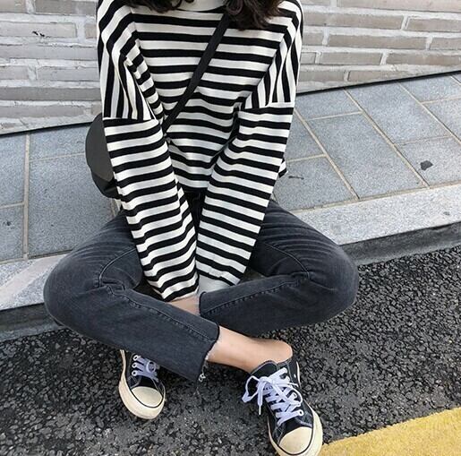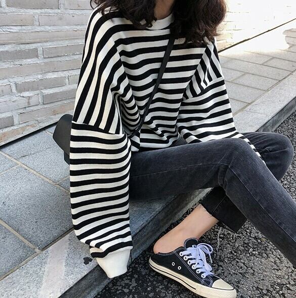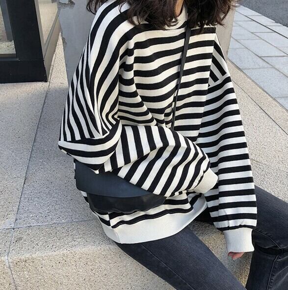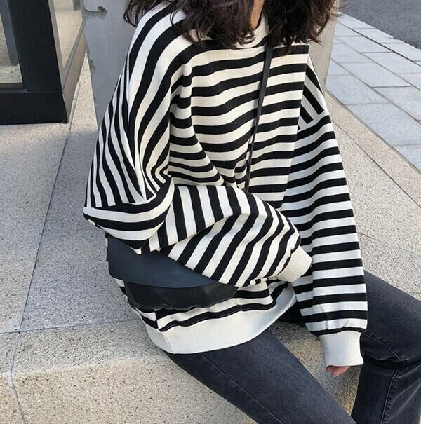 全2色 ボーダーカットソー セーター スウェット ドロップショルダー 長袖 ラウンドネック 秋 冬 大人カジュアル 休日 通学 学生 韓国 オルチャン