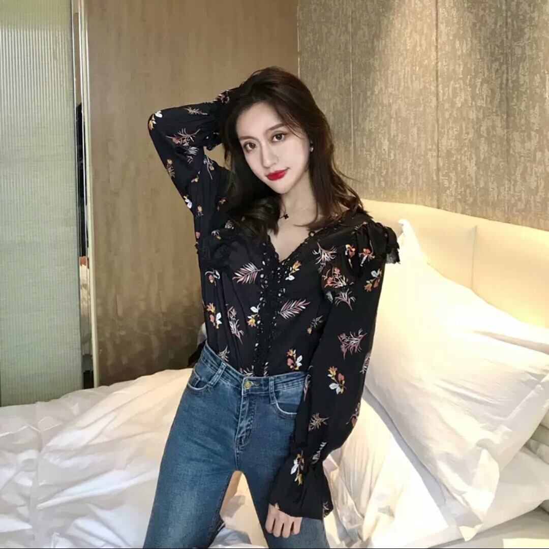 全2色 Vネック 花柄 シャツ 大人 キレイめ カジュアル 可愛い お出かけ お買い物 デート 女子会 秋冬 通学 学生 春