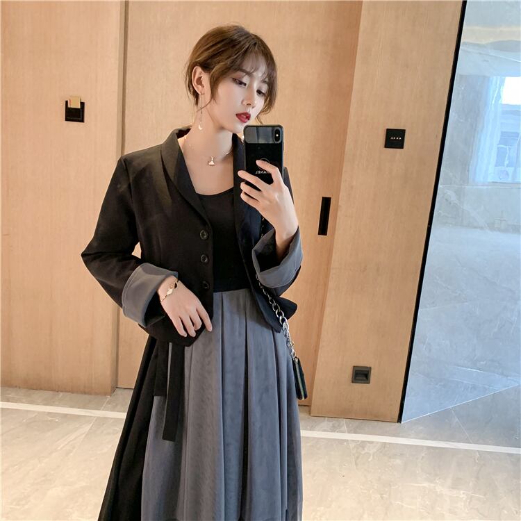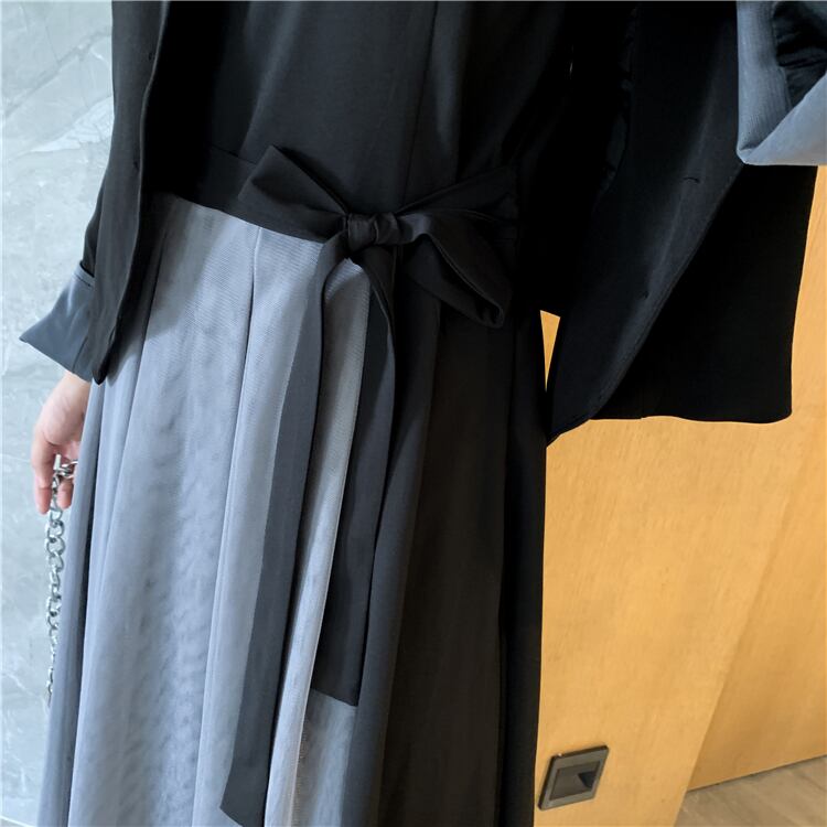 セットアップ ツーピース ジャケット ワンピース ブラック チュールワンピース ワンカラー 長袖 秋 冬 大人エレガント ウエストリボン ロング丈 韓国 オルチャン