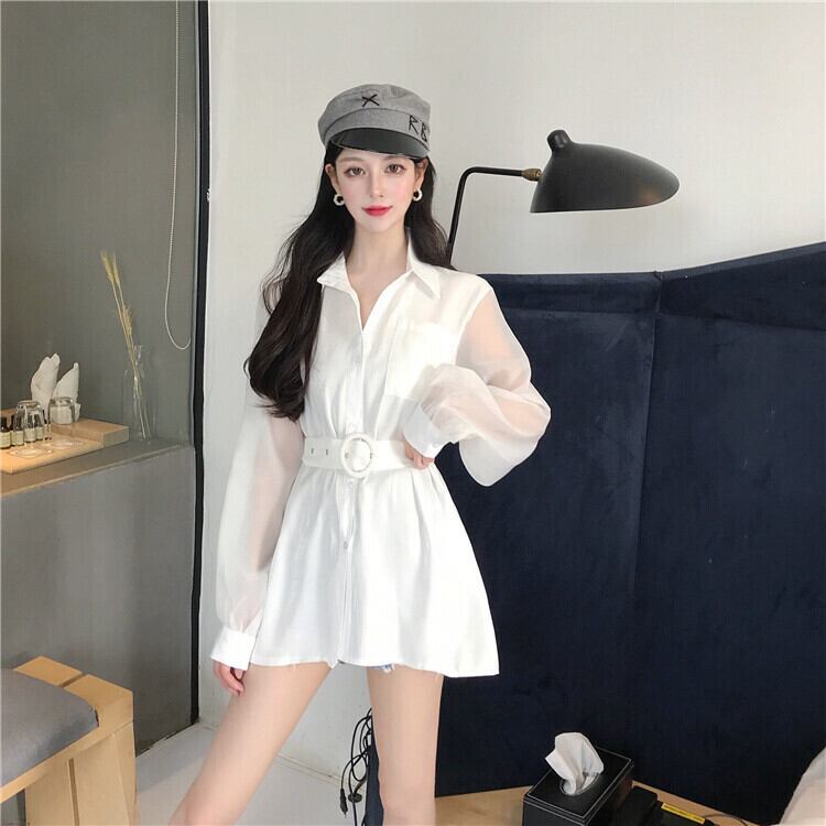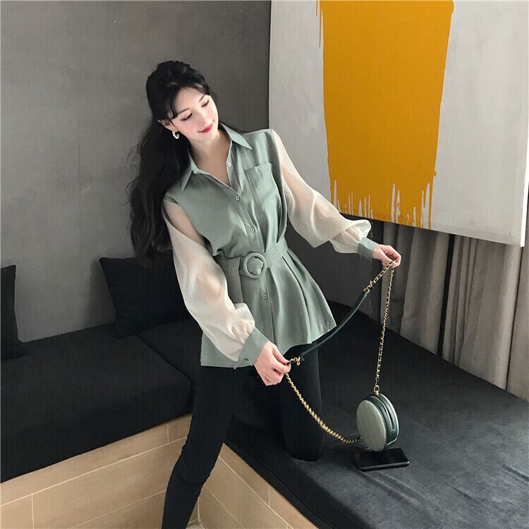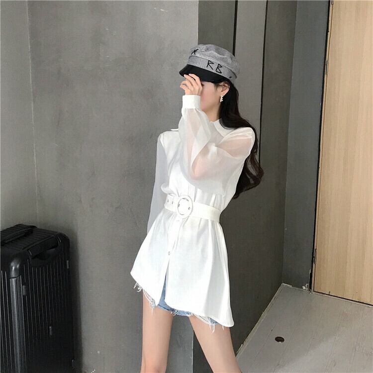 全3色 ブラウス ペプラム ウエストベルト シースルー 長袖 開襟シャツ ミドル丈 大人カジュアル エレガント カジュアルオフィス 通勤 ホワイト ブラック グリーン 韓国 オルチャン