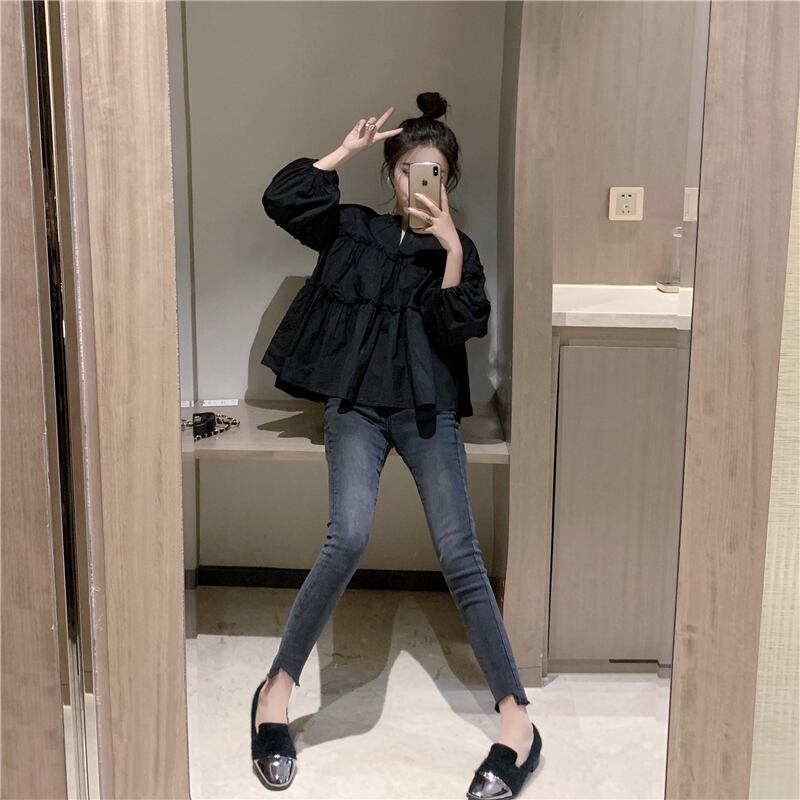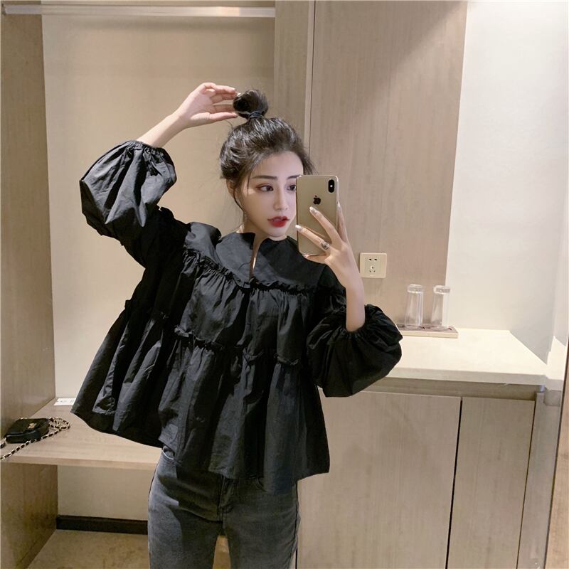 フレアブラウス ブラック バルーンスリーブ パフスリーブ フリル 大人カジュアル 秋 冬 休日 デート 韓国 オルチャン