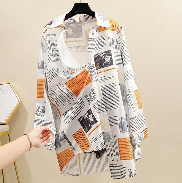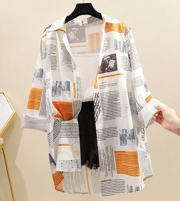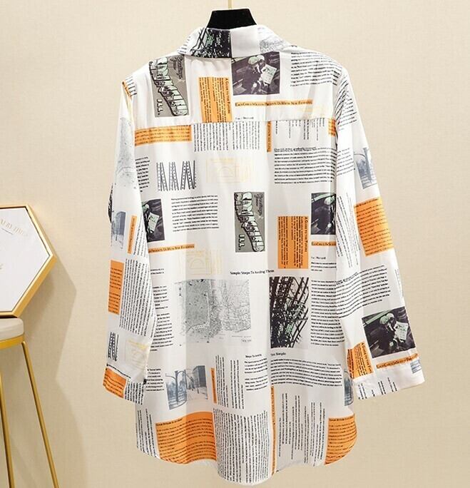 プリントブラウス カッターシャツ トップス 長袖 開襟 オレンジ 大人カジュアル 羽織 秋 冬 休日 韓国 オルチャン