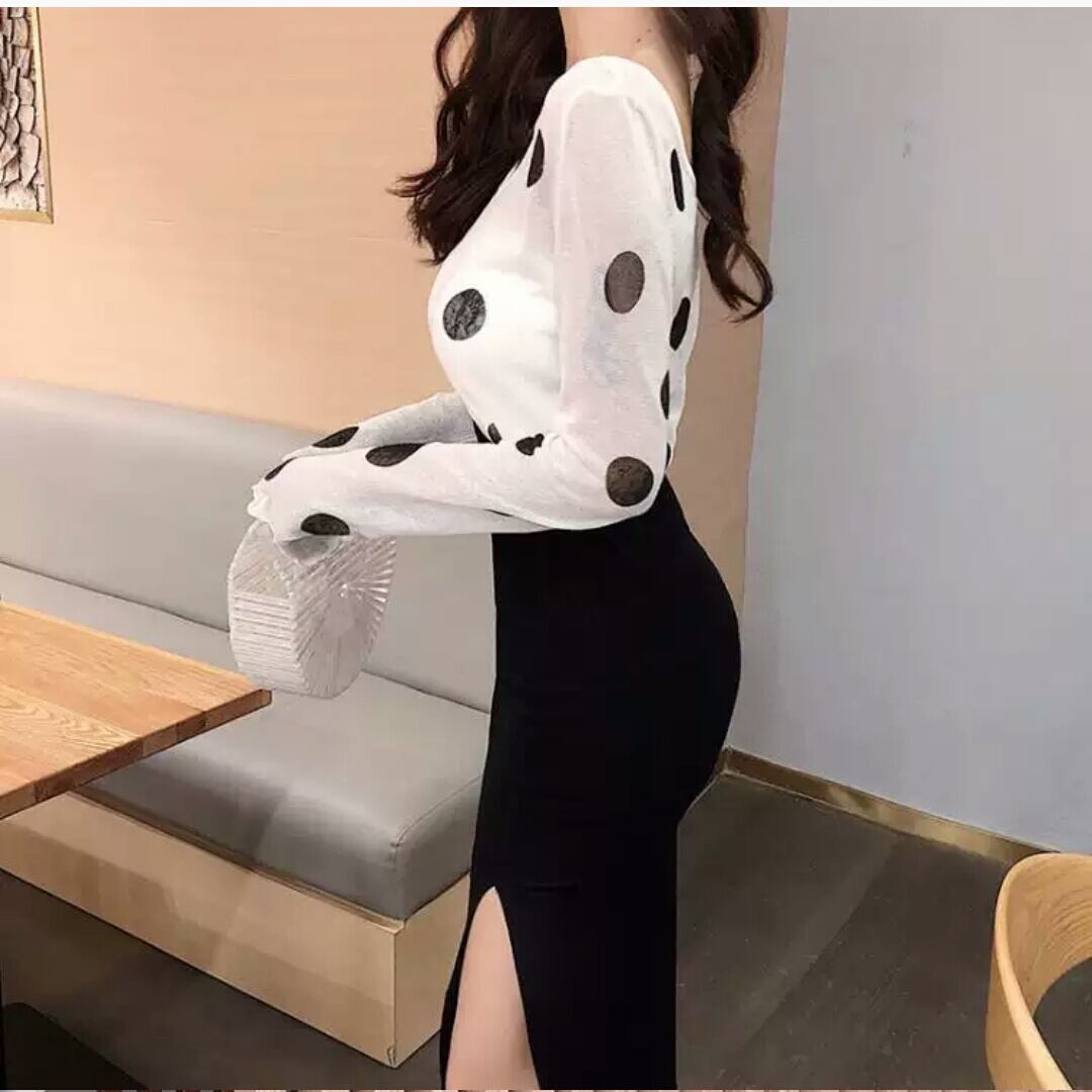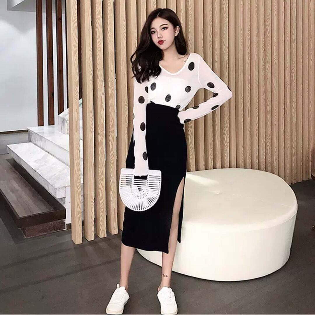 全2色 セットアップ 長袖 プルオーバー スカート タイト ハイウエスト お出かけ お買い物 デート 女子会 通勤 通学 学生 オフィス 大人 カジュアル キレイめ 水玉 ドット柄