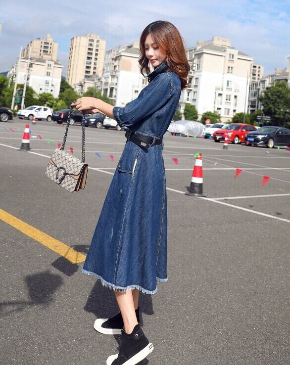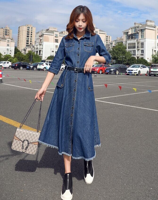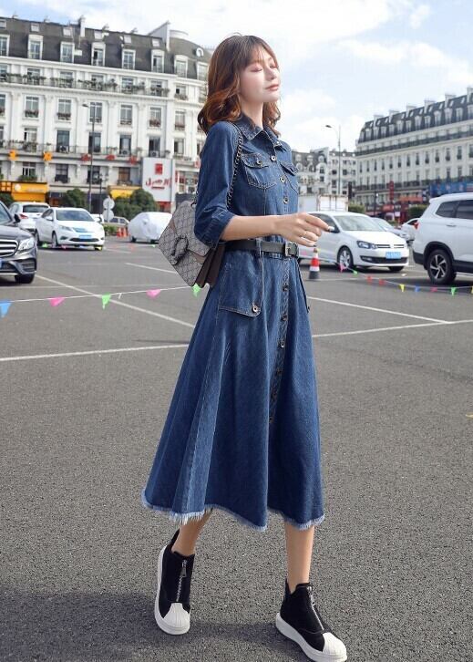 デニムワンピース デニムドレス シャツワンピース ミモレ丈 ハイウエスト 七分袖 秋 冬 開襟 サイドポケット 大人カジュアル スポーティ 休日 シンプル ベーシック