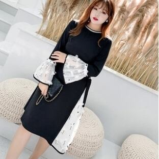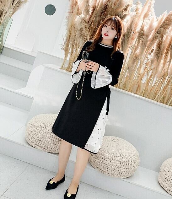 大きいサイズ ワンピース ドレス ウエストリボン 長袖 フレアスリーブ 異素材ミックス ラウンドネック 白鳥 お呼ばれ デート カジュアルパーティ