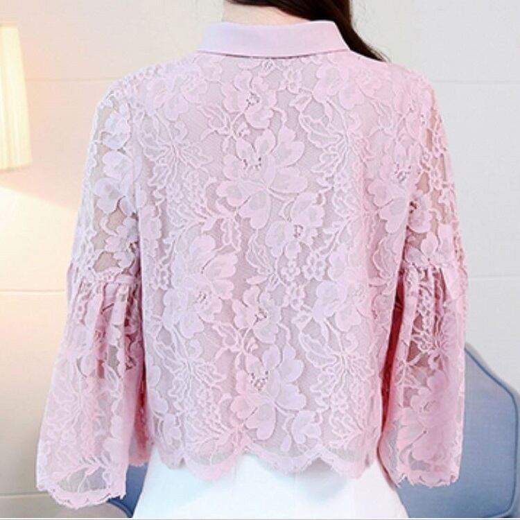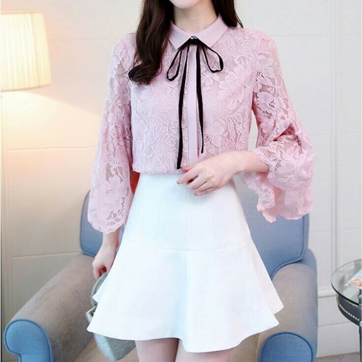 全2色 大きいサイズ ブラウス 総レース ベルスリーブ リボン 七分袖 透け感 きれいめ フォーマル パーティ 結婚式 二次会 フェミニン ガーリー ホワイト ピンク