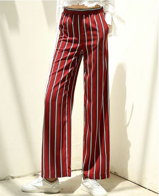 鮮やかなストライプ柄がインパクト抜群のワイドパンツ