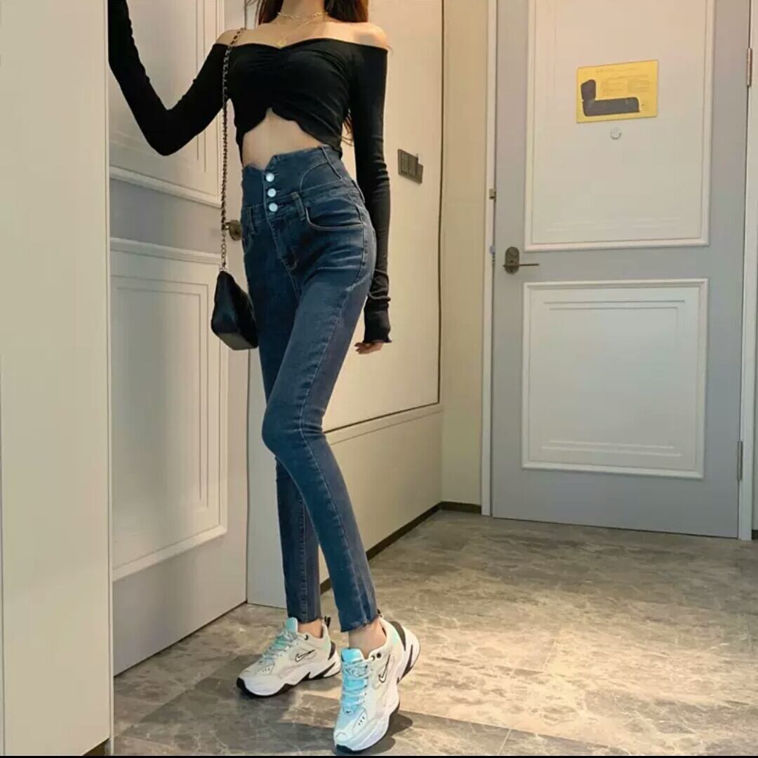 全2色 ハイウエスト ボタン スキニー デニム パンツ ボトムス お出かけ お買い物 デート 女子会 秋冬 春 通学 学生 通勤