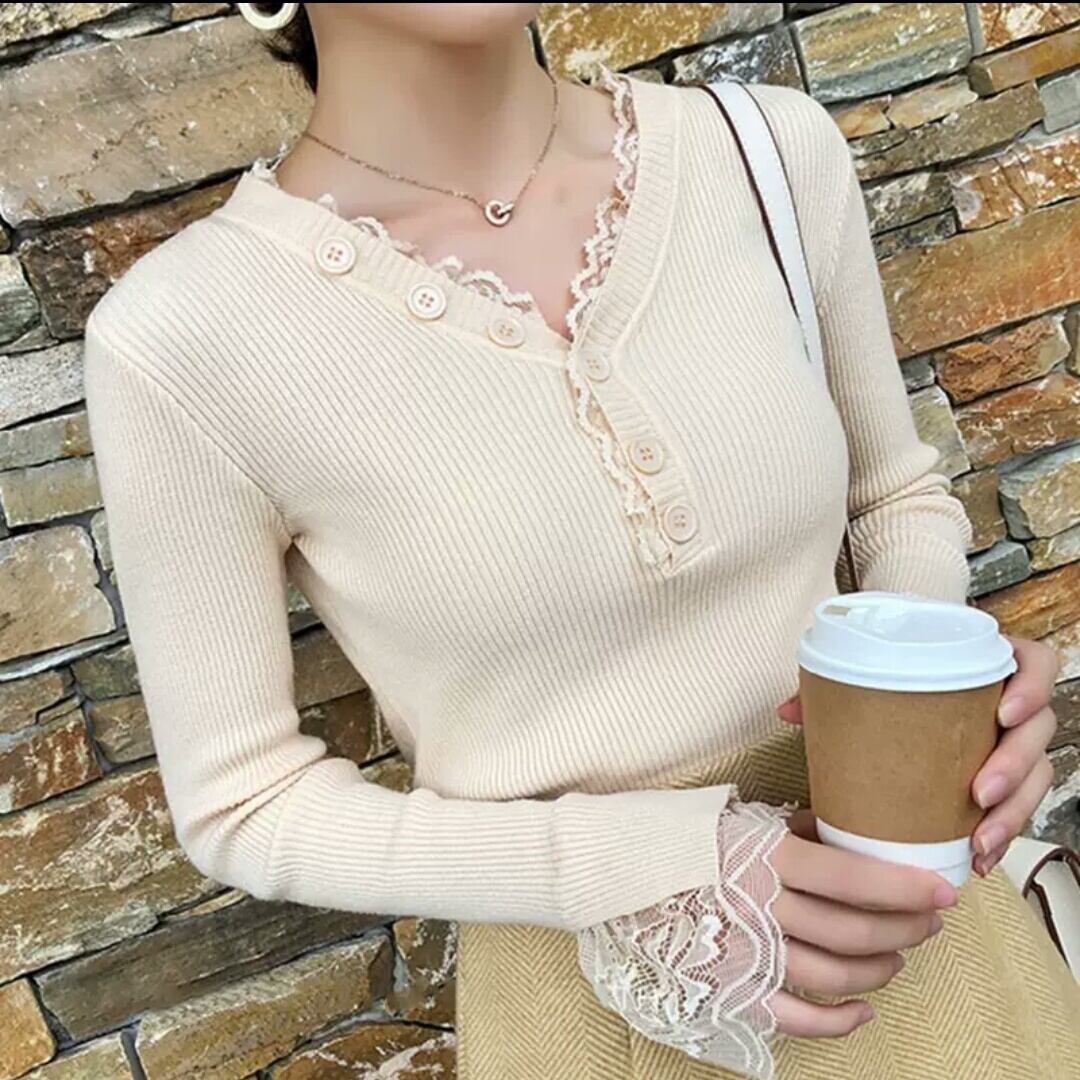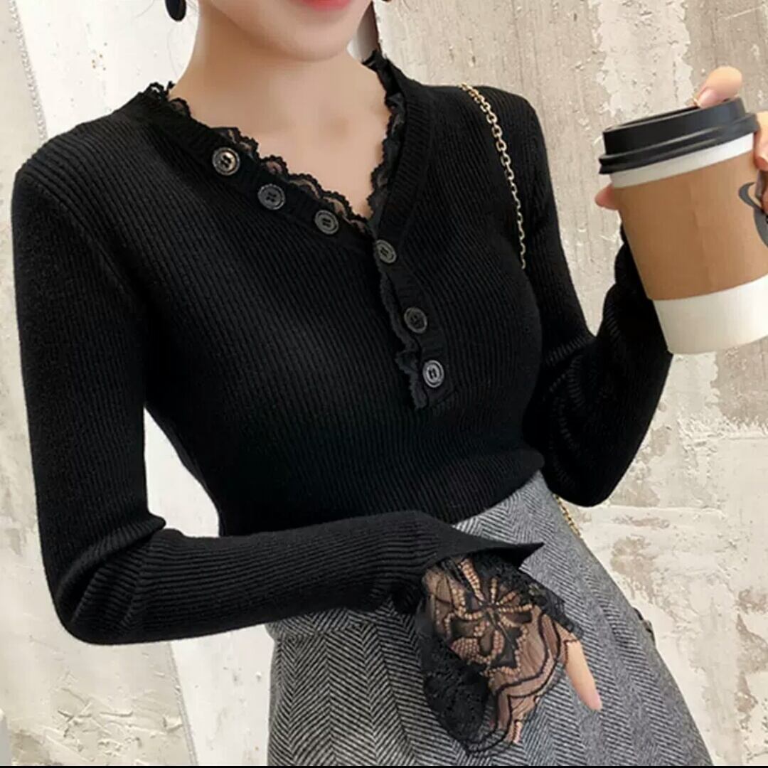 全2色 レース トップス ニット スリム フィット 長袖 大人 カジュアル キレイめ お出かけ お買い物 デート 女子会 秋冬 春 通学 通勤 学生