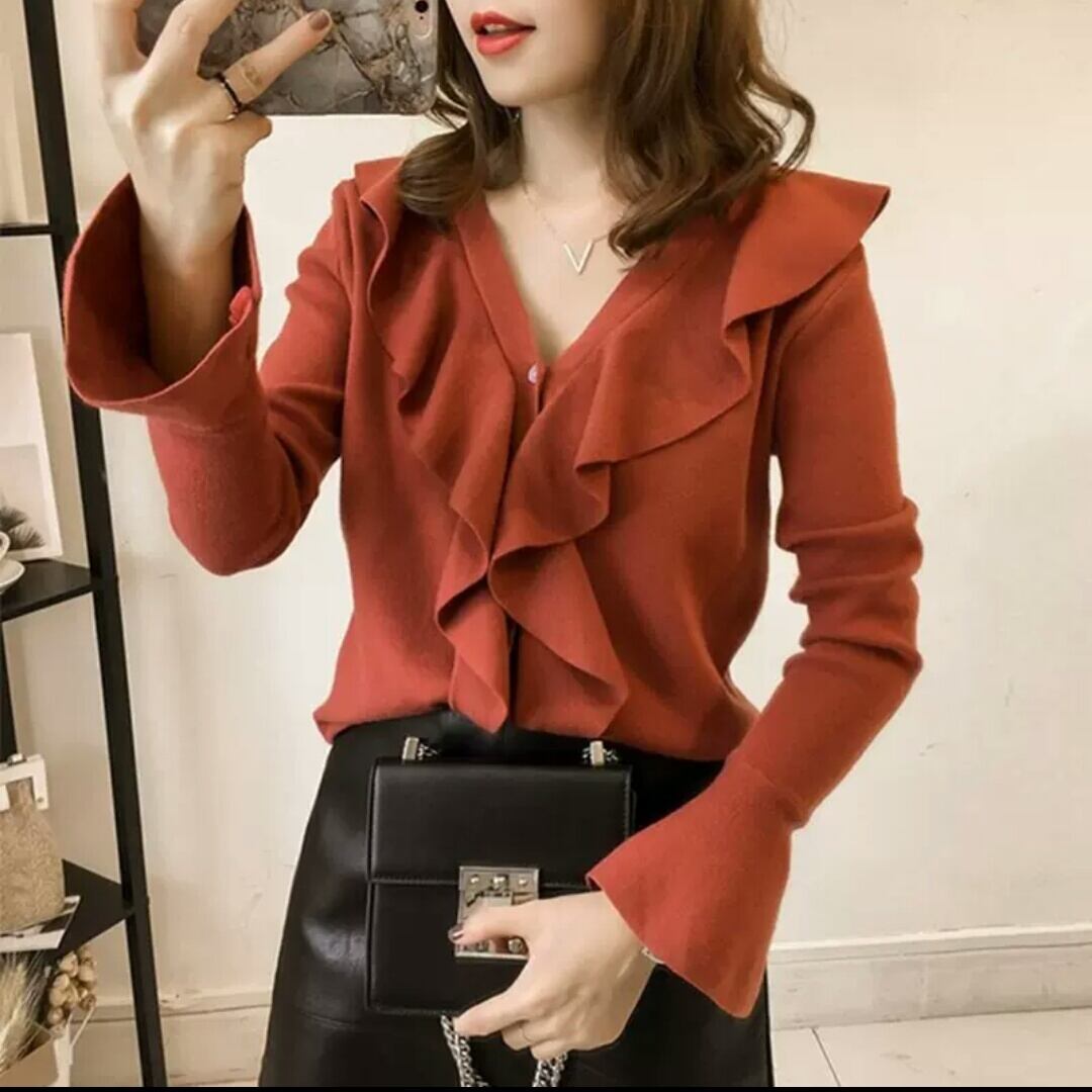 全2色 フリル トップス ニット プルオーバー Vネック 袖フレア お出かけ お買い物 デート 女子会 秋冬 通学 通勤 学生 キレイめ カジュアル シンプル