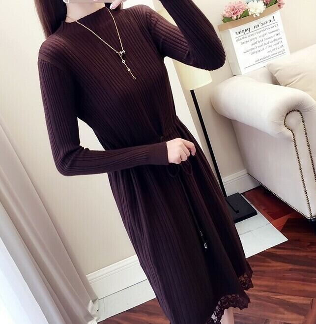 全4色 ニットワンピース ミモレ丈 ひざ丈 ドレス レース 長袖 ハイネック ベージュ ブラウン ブラック キャメル 秋 冬 上品 韓国 オルチャン