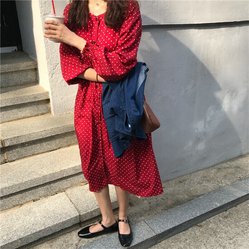 全2色 ワンピース ミモレ丈 フレア シャツワンピース ラウンドネック 長袖 水玉 ドット柄 きれいめ 上品 カジュアル トレンド レトロ 前ボタン ゆったり フリル ウエストゴム 春秋 OL レディース