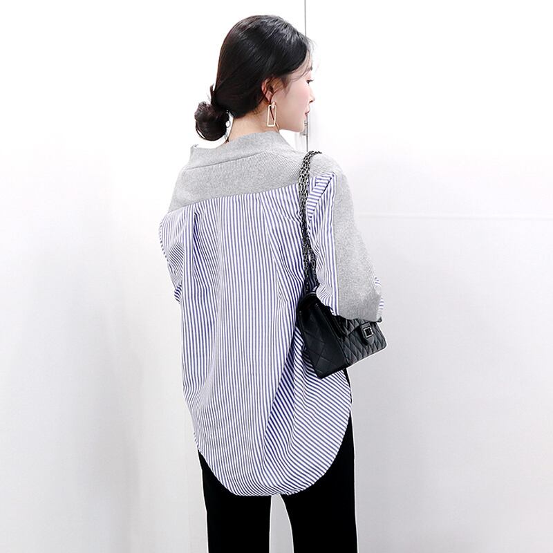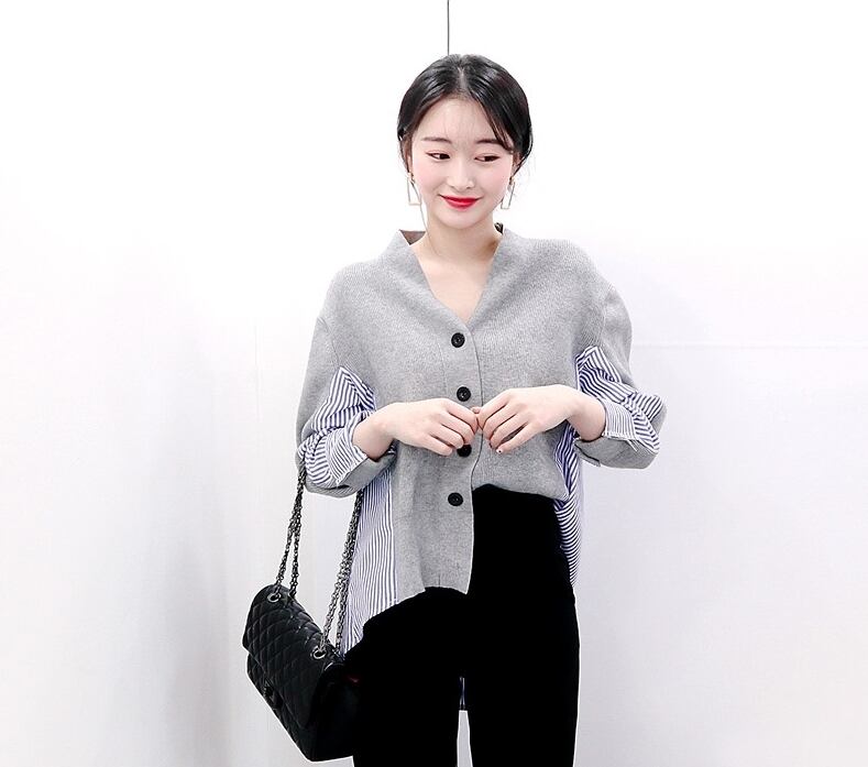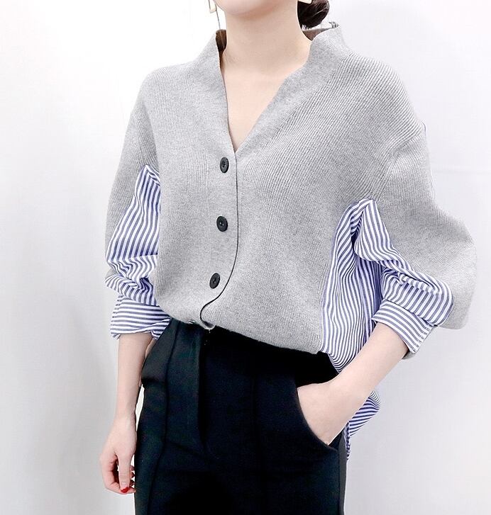 全2色 トップス ブラウス カーディガン シャツ Vネック 前ボタン 長袖 ストライプ パフスリーブ ノーカラー ロング 大人 レトロ 秋 冬 タック