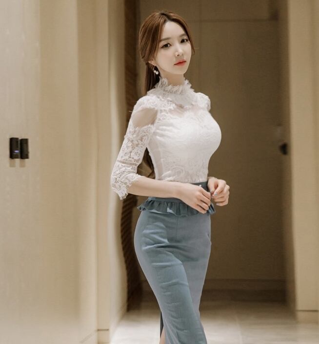 セットアップ ツービース タイト ひざ丈 レース ブラウス スカート フリル シースルー 透け感 上品 ガーリー ハイネック ハイウエスト 7分袖 ボタン エレガント きれいめ デート スリット 可愛い 春秋 OL レディース
