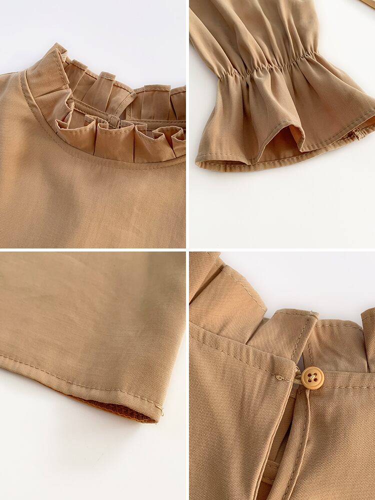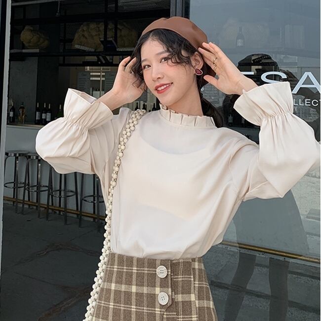 全2色 トップス プルオーバー ブラウス カットソー フリルネック フレアスリーブ フリル ゆったりめ 無地 シンプル レトロ カジュアル 大人可愛い 秋 冬 春