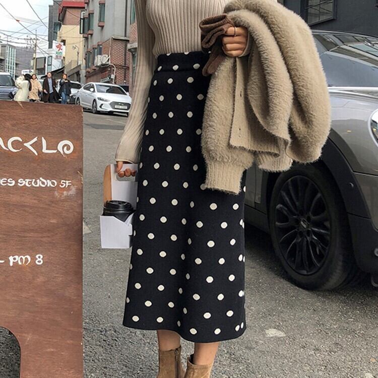 水玉スカート ミモレ丈 タイトスカート ストレッチ バックスリット ウエストゴム ブラック ドット 大人かわいい 休日コーデ 学生 通学 韓国 オルチャン 秋 冬