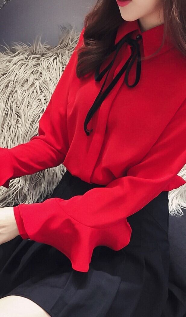 全2色 リボンブラウス シャツ トップス 開襟 長袖 フレアスリーブ レッド ホワイト 大人かわいい キュート ガーリー 学生 韓国 オルチャン