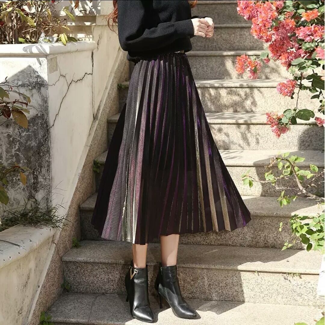 全2色 メタリック プリーツ スカート 選べる丈 ハイウエスト お出かけ お買い物 デート 女子会 秋冬 春 通学 学生 通勤 大人 カジュアル キレイめ