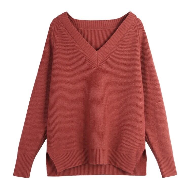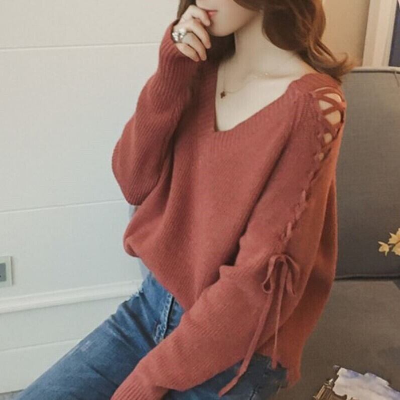 全4色 ニット セーター Vネック 編み上げ 肩見せ 長袖 無地 シンプル ゆったり きれいめ カジュアル お出かけ デート カーキ ダークグリーン ブルー レッド 秋冬
