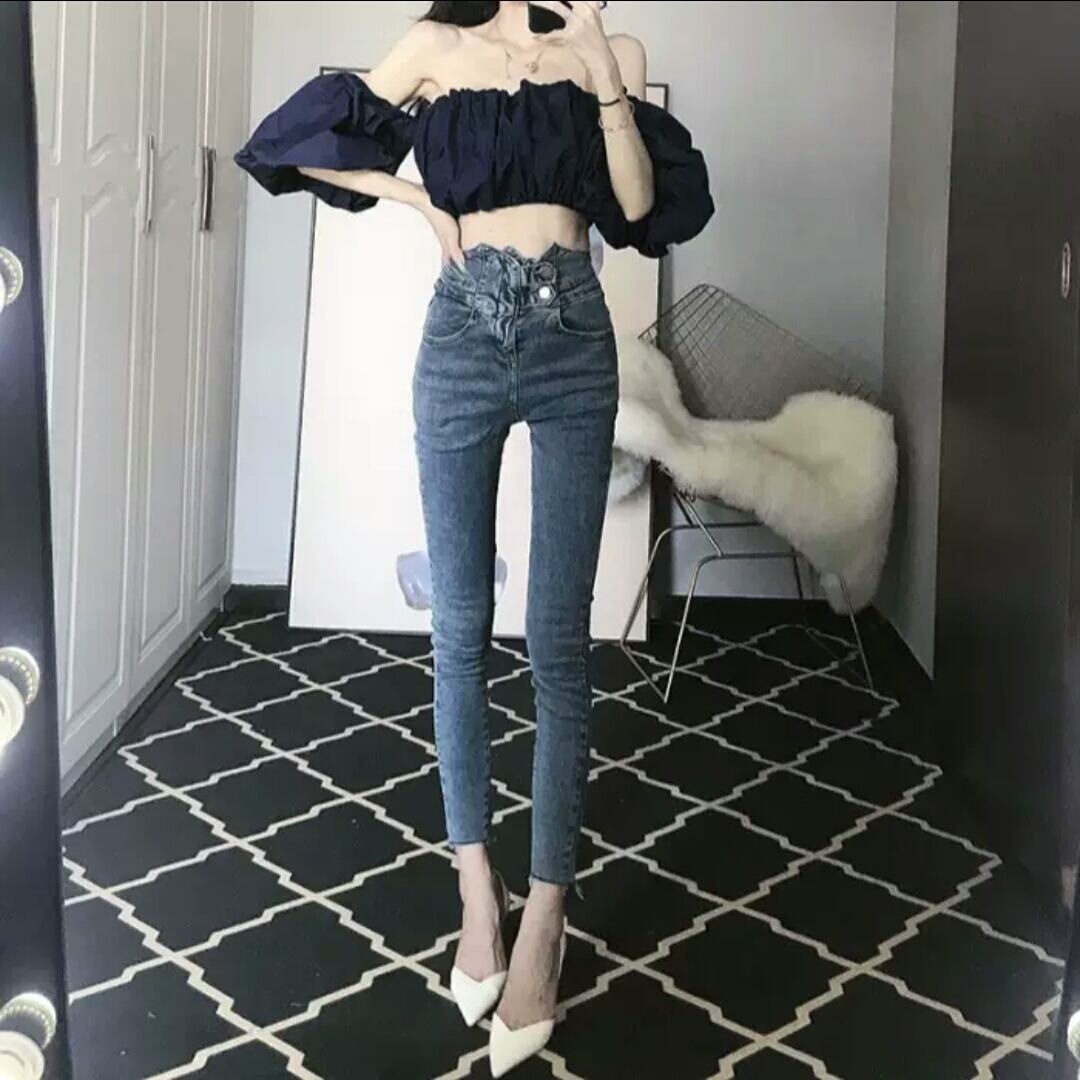 ハイウエスト デニムパンツ スキニー ボタン デザイン お出かけ お買い物 デート 女子会 秋冬 黒 大人 カジュアル キレイめ 通学 通勤 学生