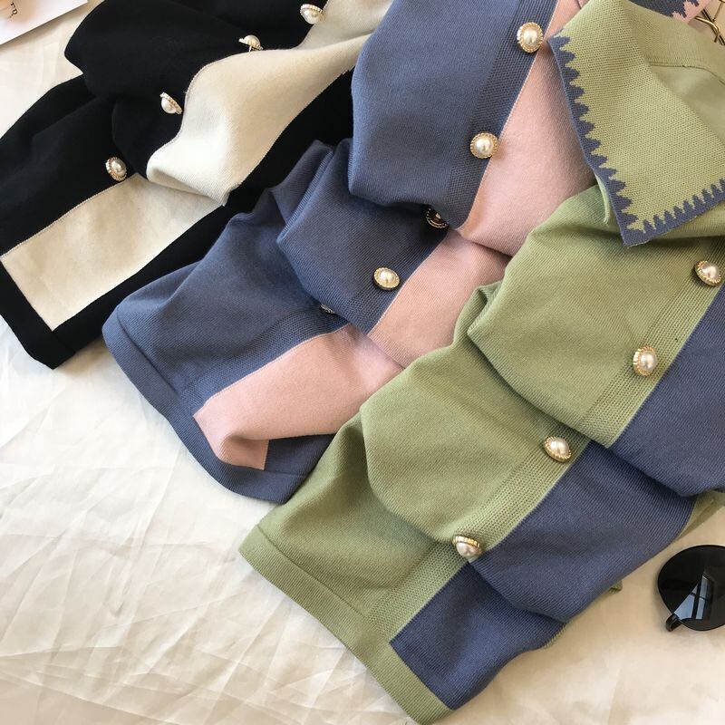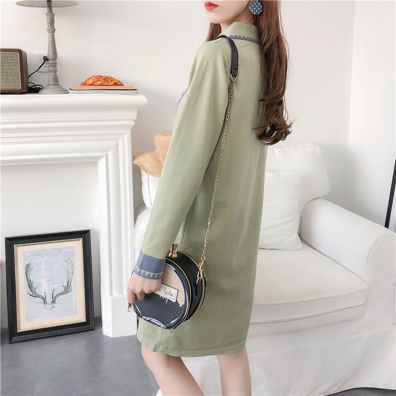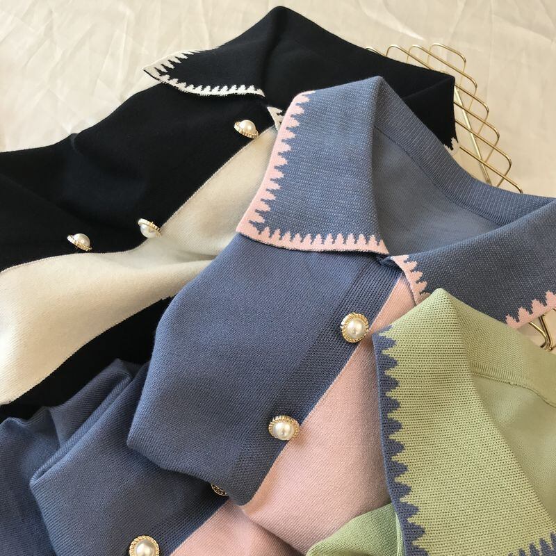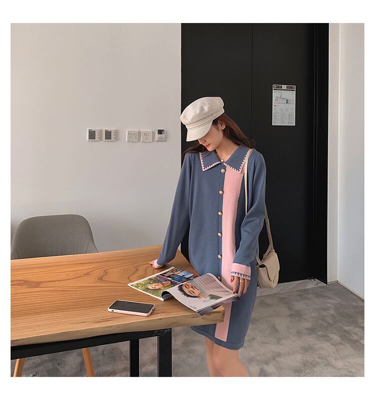 全3色 ワンピース ひざ丈 長袖 ポロ襟 配色 Iライン バイカラー パール調ボタン 秋冬 お出かけ デート 女子会 きれいめ エレガント 大人可愛い モード フェミニン 上品 レトロ