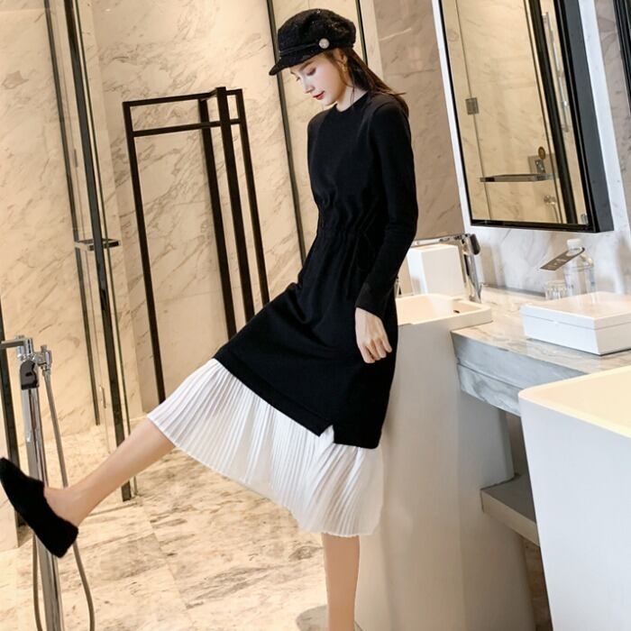 全4色 ドッキングワンピース ドレス ミドル丈 ラウンドネック 長袖 プリーツ キャメル レッド ベージュ ブラック 大人カジュアル 大人かわいい 韓国 オルチャン 秋 冬