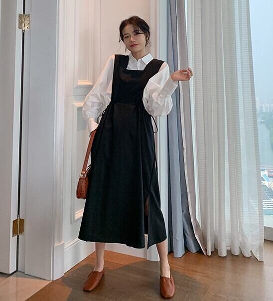 ノースリーブワンピース ジャンパースカート ブラック ロング丈 サイドリボン 上品 エレガント 大人かわいい 学生 通学 秋 冬 韓国 オルチャン フェミニン レトロ デート