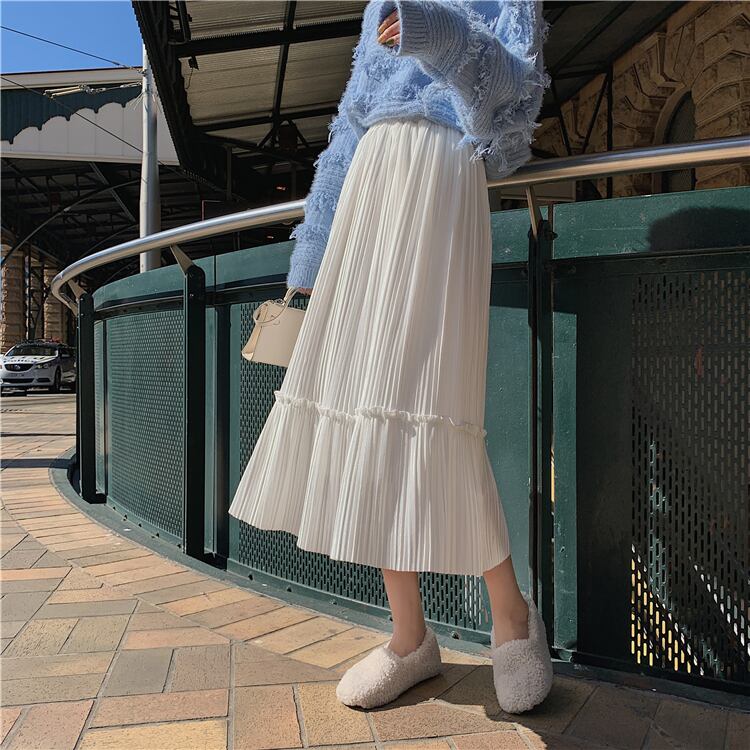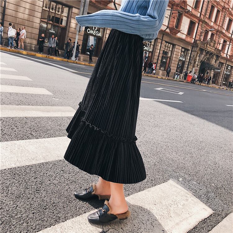 全6色 プリーツスカート ロングスカート ベロア ハイウエスト ウエストゴム 大人カジュアル 上品 エレガント 休日コーデ 秋 冬 韓国 オルチャン