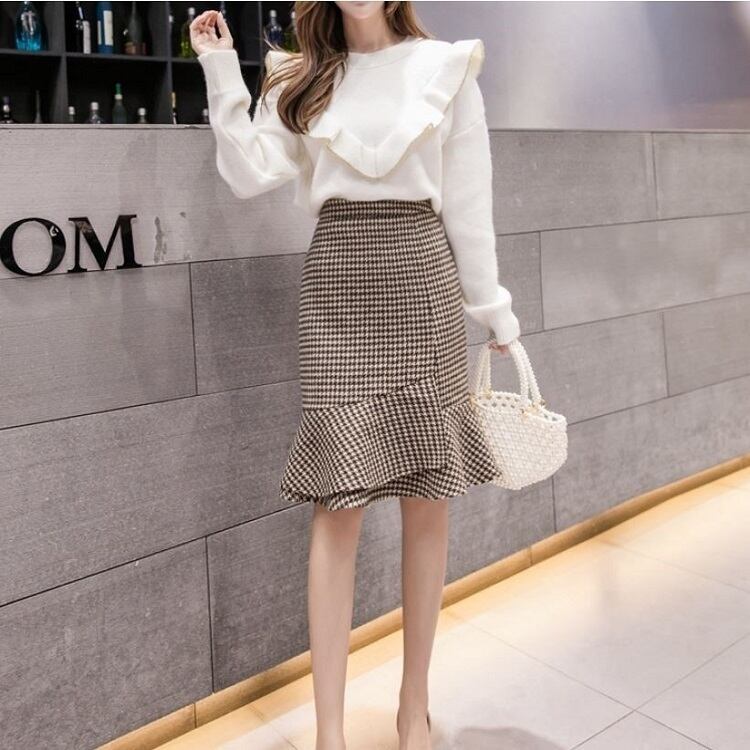 全2色 タイトスカート フィッシュテール 千鳥格子 ひざ丈 ハイウエスト レトロ シンプル きれいめ 上品 お出かけ デート 通勤 オフィス 秋冬 カーキ グレー