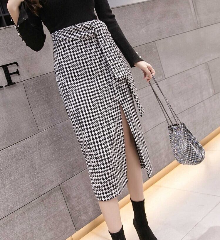 全2色 スリットスカート スカート ハイウエスト ミディ丈 ウエストリボン 千鳥格子 レトロ セクシー シンプル きれいめ 上品 お出かけ 通勤 オフィス 秋冬 ブラックブラウン