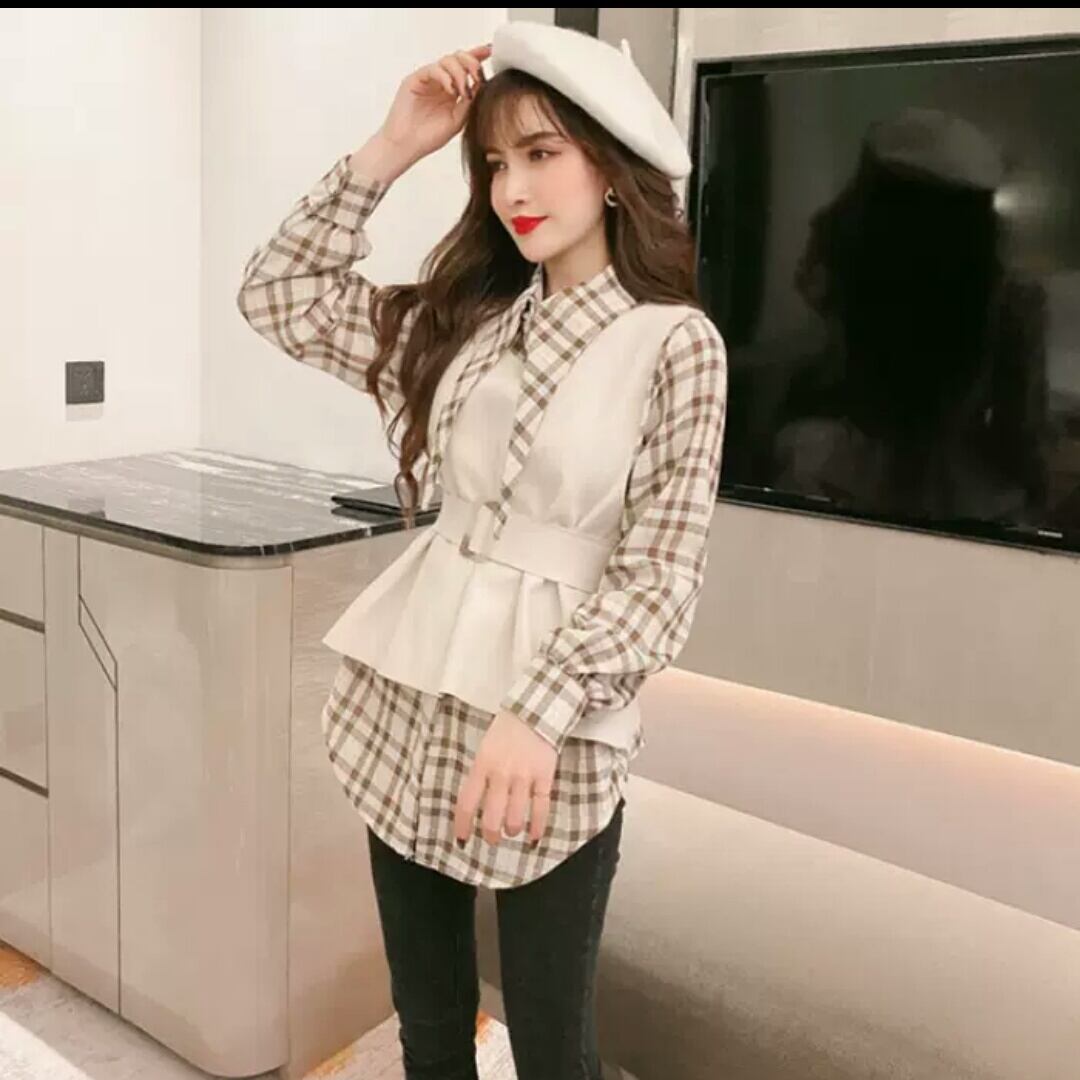 全2色 チェック柄 ベスト ツーピース セットアップ 長袖 大人 カジュアル 可愛い お出かけ お買い物 デート 女子会 秋冬 春 通学 通勤 学生