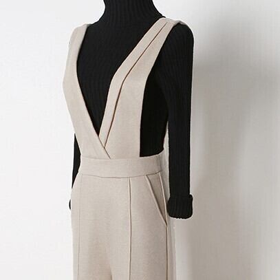 全3色 サロペット ワイドパンツ Vネック 秋 冬 ベージュ ブラック ネイビー 大人カジュアル ガーリー 休日 デート お出かけ