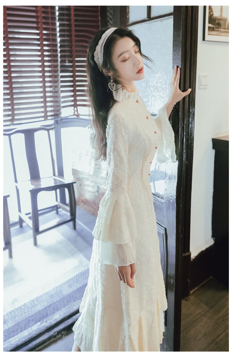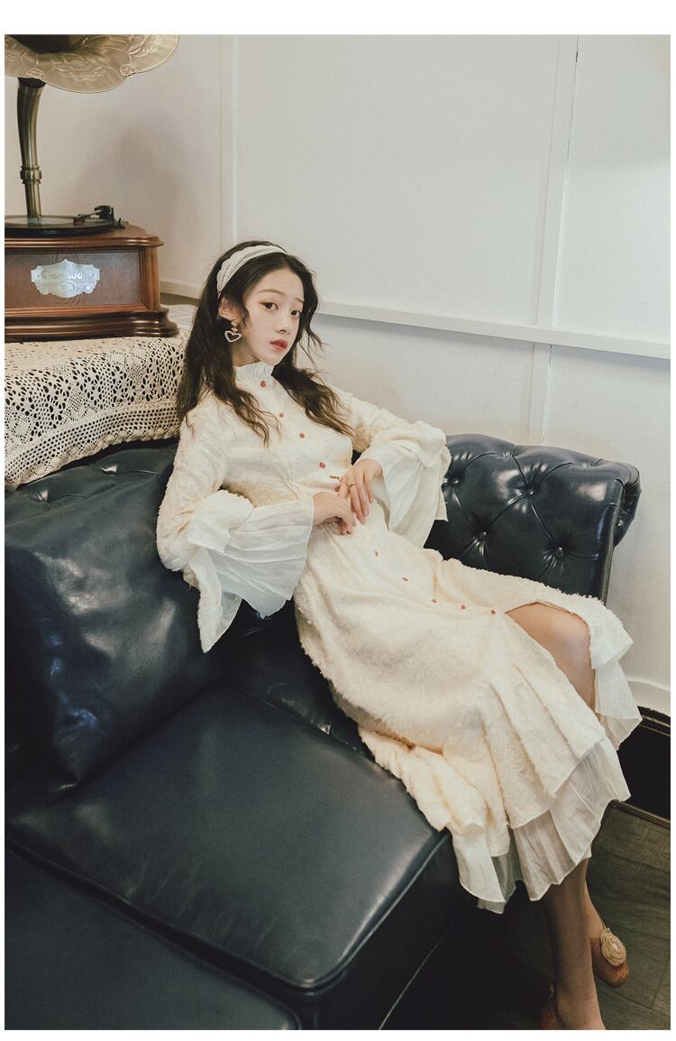 ドレス 刺繍 レース フレア袖 長袖 ミモレ丈 ワンピース スカート Aライン パーティードレス ハイネック 秋冬 お出かけ 二次会 デート 謝恩会 発表会 フォーマル エレガント フェミニン 大人可愛い きれいめ ドレスワンピ