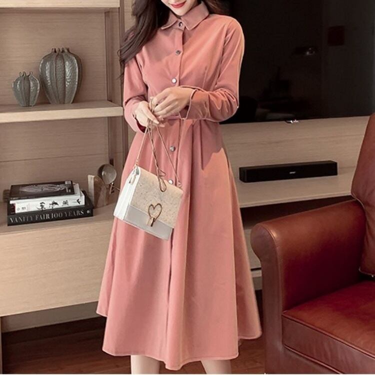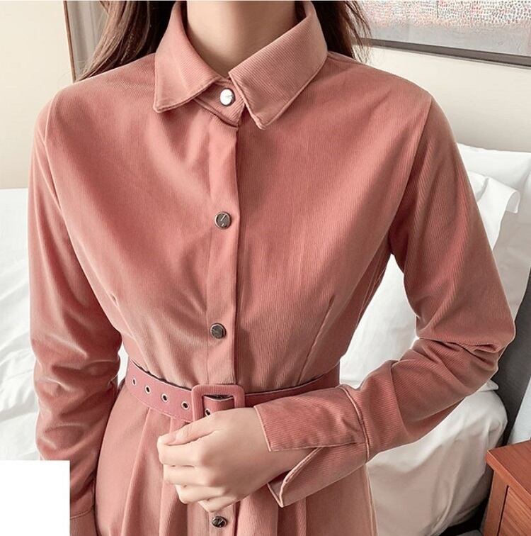 全2色 ワンピース シャツワンピース ロング丈 長袖 無地 レトロ シンプル フレアスカート コーデュロイ 上品 カジュアル お出かけ 通学 通勤 秋冬 ピンク ブルー