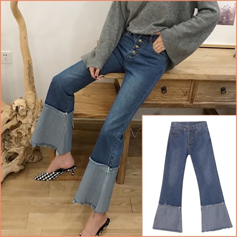 裾での切り替えデザインが目を引く、ブーツカットジーンズです。