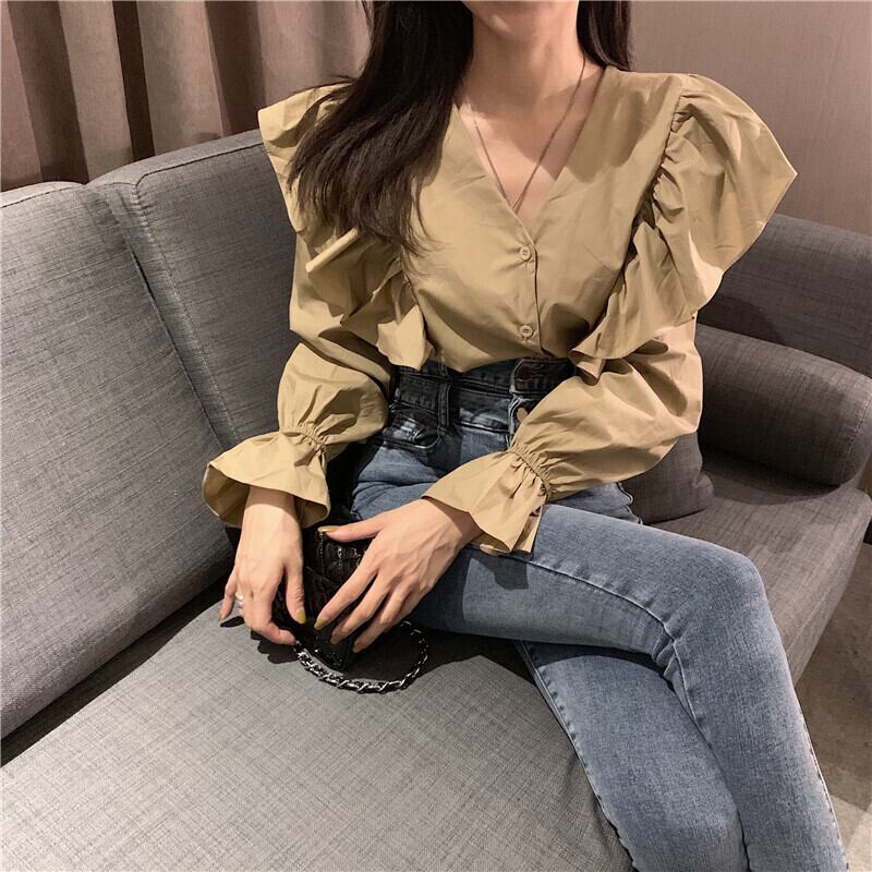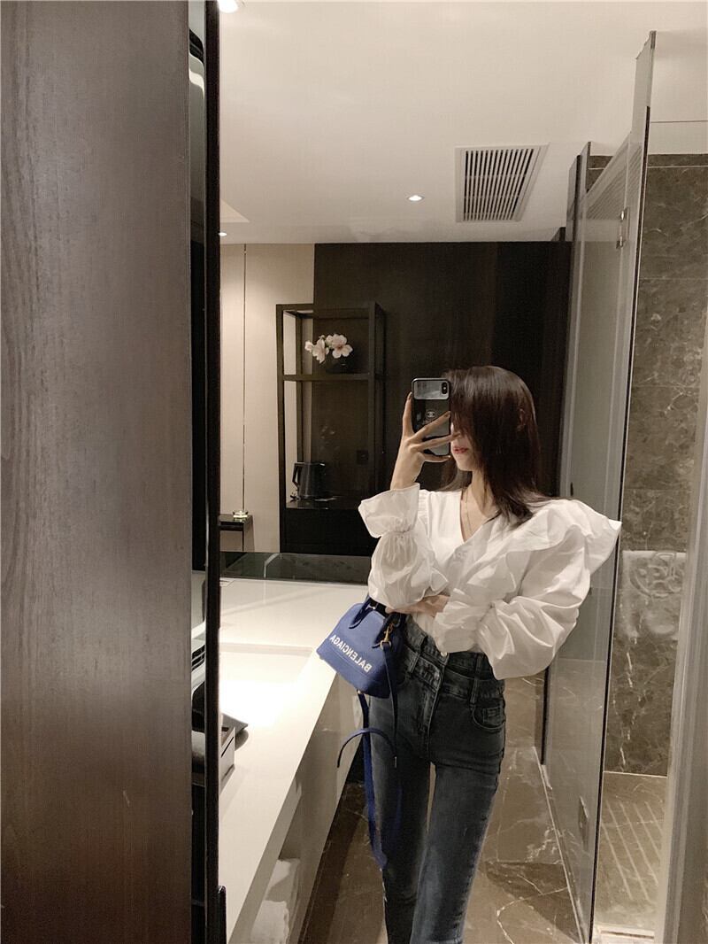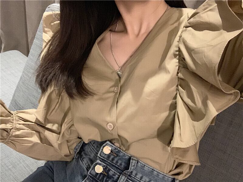 全2色 フリルブラウス シャツ Vネック 長袖 秋 冬 ベージュ ホワイト 大人かわいい 大人きれい 大人カジュアル 休日コーデ デート 韓国 オルチャン レトロ フェミニン