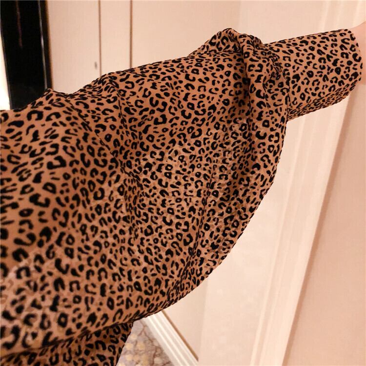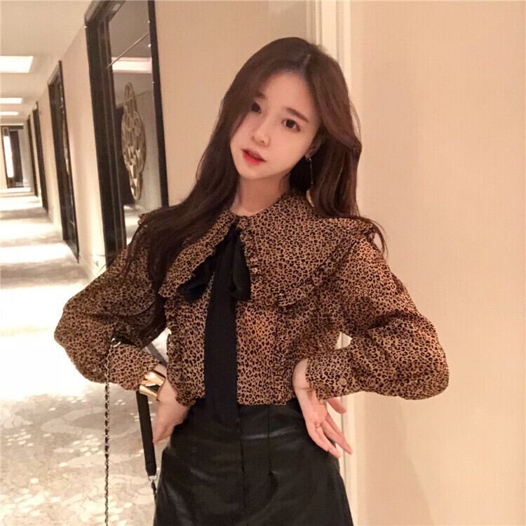 レオパード柄ブラウス リボンブラウス シャツ 長袖 バルーン袖 カフス フリル 大人かわいい 大人きれい 韓国 オルチャン 春秋 秋冬 OL レディース