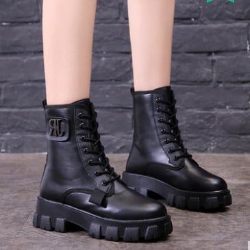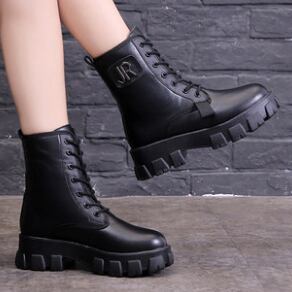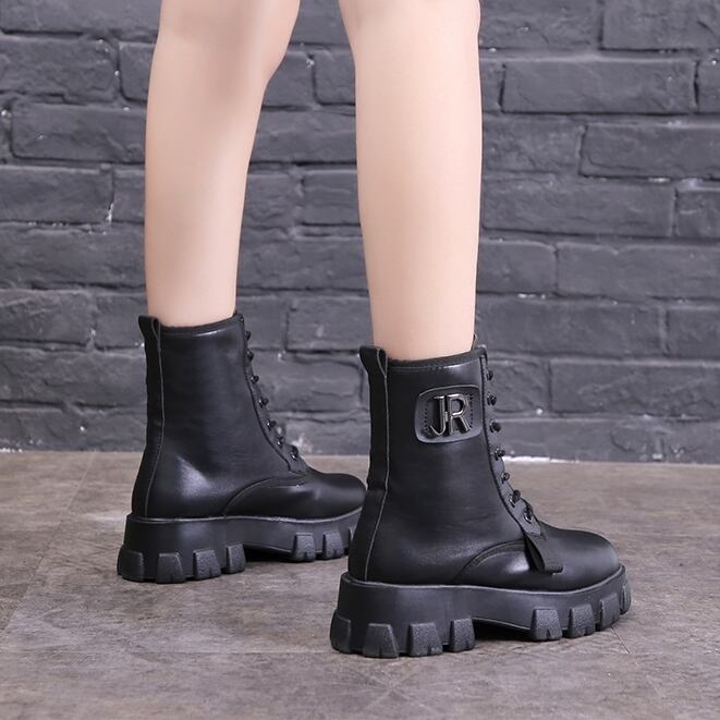 ショートブーツ 編み上げ 厚底 ブラック シンプル フラットヒール 脚長 お出かけ カジュアル 秋冬