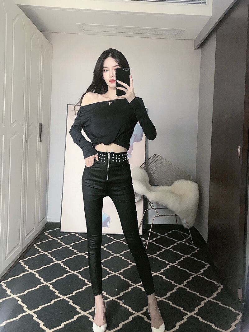 スキニーパンツ レギンスパンツ ビジュー フロントジッパー フィット ハイウエスト スリム 秋 冬 ブラック 大人カジュアル ハード 韓国 オルチャン