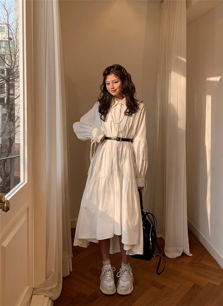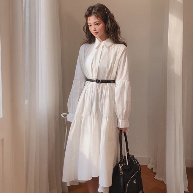 ワンピース シャツワンピース フロントボタン ウエストベルト ティアード フレア フリル アシンメトリー ガーリー 大人可愛い カジュアル きれいめ 長袖 秋 春 冬