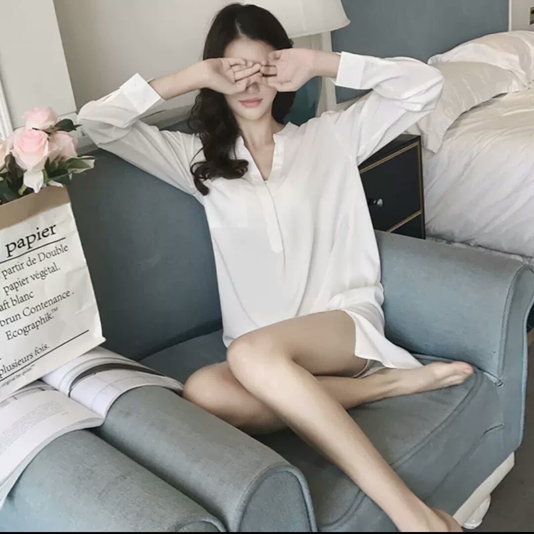 全2色 Vネック シンプル シフォン ロング シャツ 大人 キレイめ カジュアル 無地 お出かけ お買い物 デート 女子会 韓国ファッション 春秋 OL レディース
