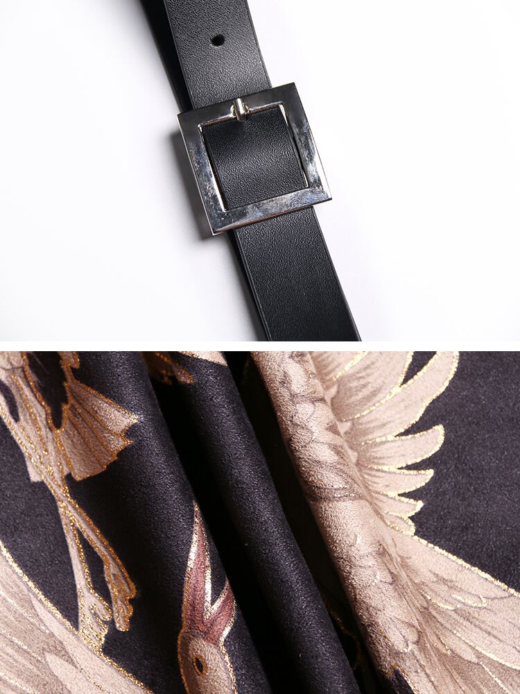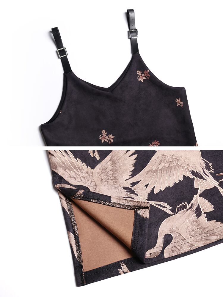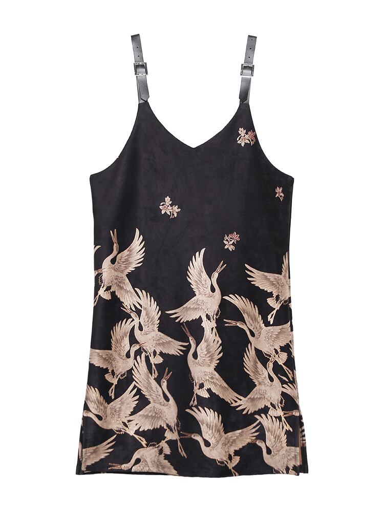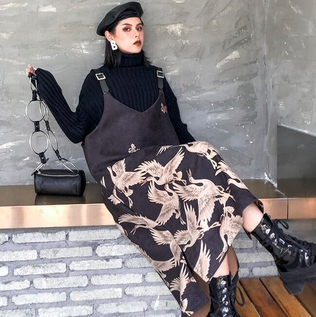 ジャンパースカート ワンピース 鶴柄 アニマル キャミワンピース モノトーン ロング丈 上品 カジュアル スリット 大人 ビッグシルエット オーバーサイズ ゆったり 春秋 OL