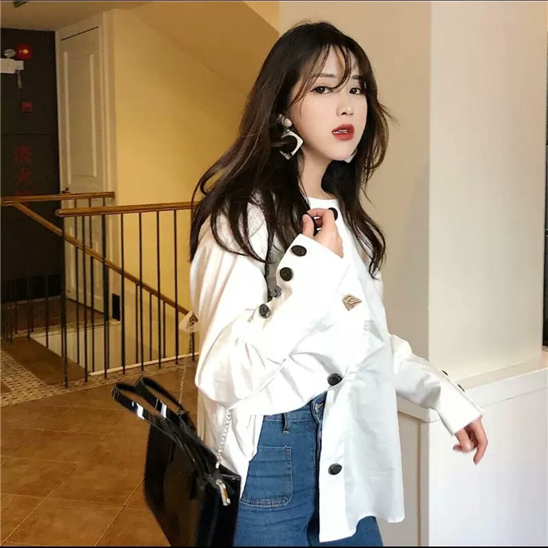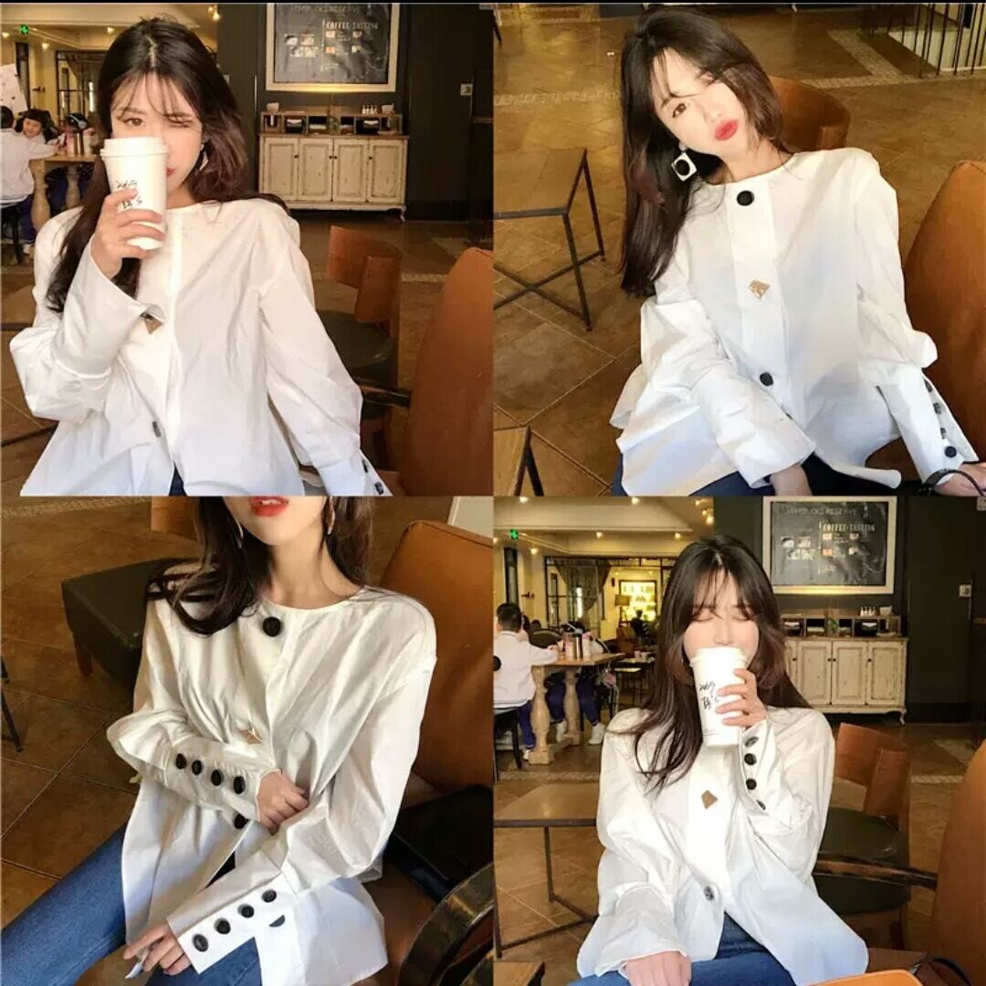ラウンドネック シャツ デザインボタン 大人 キレイめ 可愛い カジュアル お出かけ お買い物 デート 女子会 韓国ファッション オルチャン 春秋 OL